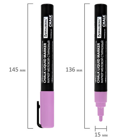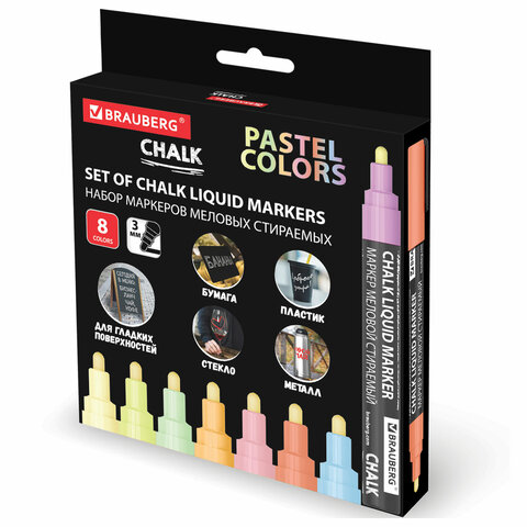 Стираемые меловые маркеры BRAUBERG "CHALK" предназначены для создания рисунков и надписей на гладких и прозрачных невпитывающих поверхностях (например, зеркалах, стекле, меловой пленке). Подходят для школьных занятий, идеальны для детского творчества!