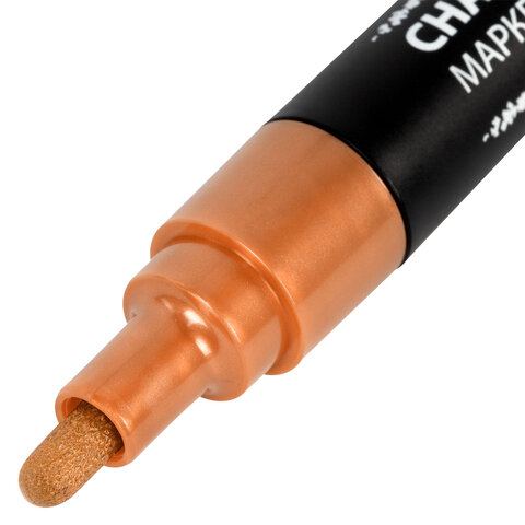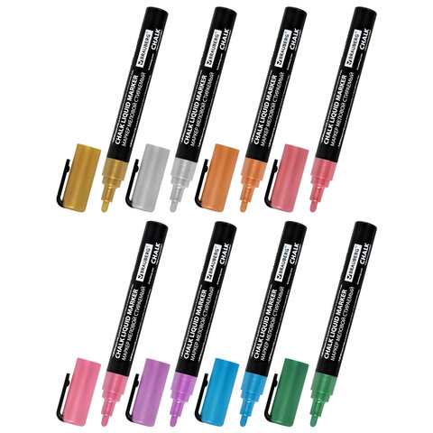 В наборе 8 меловых маркеров с цветами металлик: золотистый, серебристый, бронзовый, лавандовый, красный, темно-зеленый, розовый, синий. Рисунок получается плотный и яркий. Чернила на водно-меловой основе без резкого запаха. Толщина линии письма – от 1 мм до 3 мм, зависит от угла наклона мелового маркера. Круглый корпус выполнен из пластика.