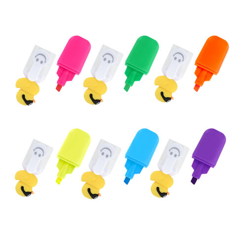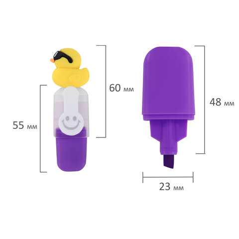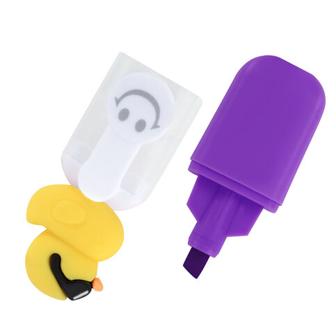 Текстовыделители имеют плоскую форму корпуса с диаметром 23 мм. Колпак украшен ярким топпером в форме утёнка. Скошенный наконечник с толщиной линии письма от 1 до 4 мм обеспечивает удобство при работе с текстом, напечатанным мелким шрифтом, или таблицами. В комплект входит прозрачная сумочка для хранения длиной 15,5 см.