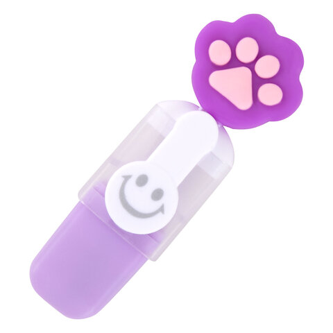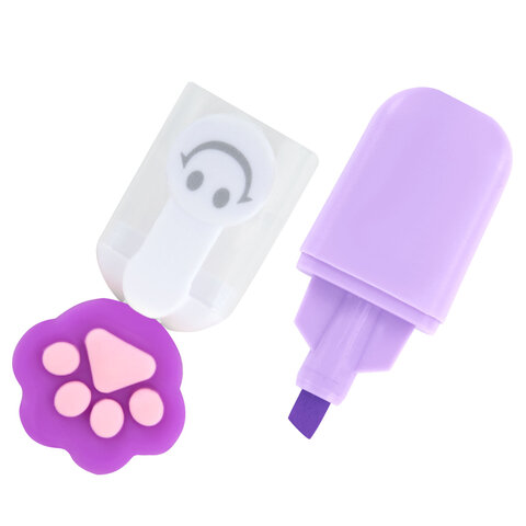 Текстовыделители имеют плоскую форму корпуса с диаметром 23 мм. Колпак украшен ярким топпером в форме лапки. Скошенный наконечник с толщиной линии письма от 1 до 4 мм обеспечивает удобство при работе с текстом, напечатанным мелким шрифтом, или таблицами. В комплект входит прозрачная сумочка для хранения длиной 15,5 см.