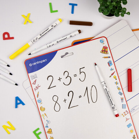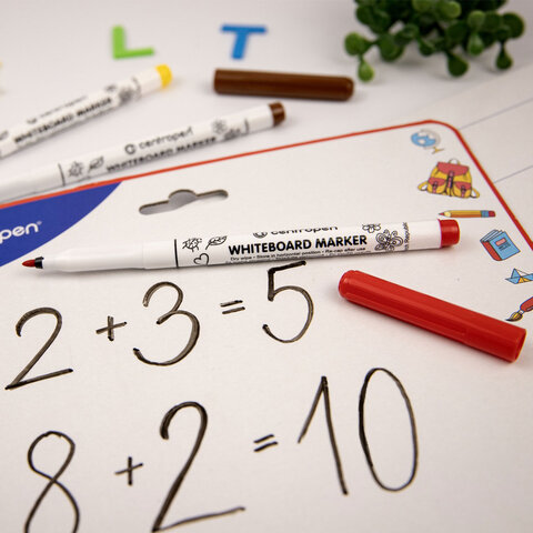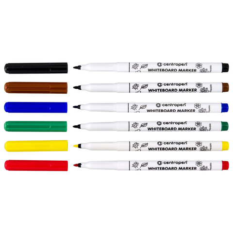 Набор маркеров для белой доски, 6 цветов. Стираемые в сухом состоянии. Светостойкие, на спиртовой основе. Цилиндрический пишущий узел. Фетровый (пористый) наконечник. Толщина линии – 1–2 мм. Хранить в горизонтальном виде.