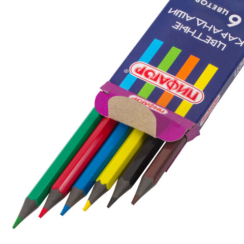 Набор состоит из 6 цветов: красный, желтый, зеленый, голубой, коричневый, черный. Шестигранная форма сечения корпуса позволяет карандашу не скатываться с поверхности стола во время занятий рисованием. Карандаши изготовлены из переработанного пластика и имеют лакированный корпус, который при разломе не образует острые края и безопасен для детей. Легко затачиваются. Грифель диаметром 2,65 мм обладает повышенной прочностью. Все карандаши заточены и поставляются в картонной упаковке с европодвесом.