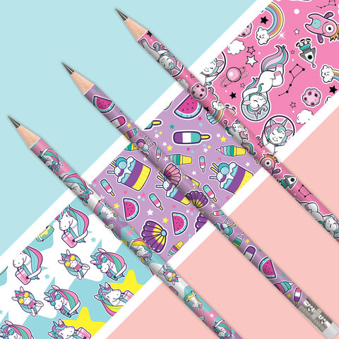Карандаш чернографитный ЮНЛАНДИЯ "ЕДИНОРОГИ", 1 шт., HB, с ластиком, корпус ассорти, 181780