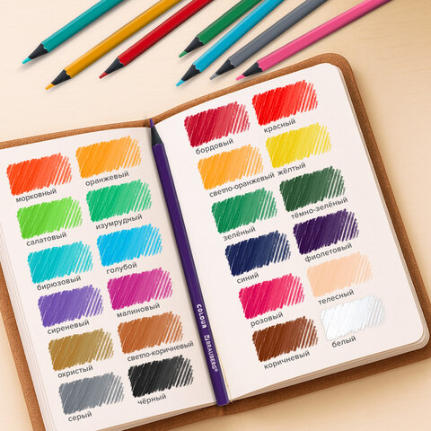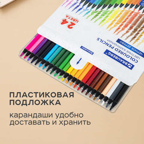 В наборе 24 цвета: черный, темно-синий, синий, голубой, салатовый, зеленый, темно-зеленый, болотный, серо-зеленый, желтый, оранжевый, темно-оранжевый, персиковый, фуксия, розовый, красный, темно-красный, бордовый, песочный, серый, светло-серый, фиолетовый, темно-коричневый, коричневый. Шестигранная форма корпуса позволяет карандашу не скатываться с поверхности стола во время занятий рисованием. Карандаши изготовлены из чёрной древесины ценных пород и имеют лакированный корпус. Высокосортная древесина и качество исполнения гарантируют легкую заточку. Грифель диаметром 3,3 мм обладает повышенной прочностью. Внутри упаковки предусмотрена пластиковая подложка для карандашей для дополнительного комфорта при ежедневном использовании. Все карандаши заточены и поставляются в картонной упаковке с европодвесом. Рисование цветными карандашами способствует развитию творческого мышления, мелкой моторики рук, цветового восприятия, фантазии и воображения ребенка.