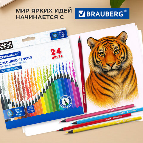 Карандаши цветные BRAUBERG, 24 цвета, шестигранные, грифель 3,3 мм, черное дерево, 181858