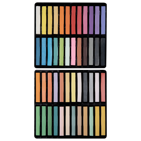 Легко ложится на различные фактуры цветной бумаги, бумагу для рисования, холст, картон, дерево, керамику. Также можно наносить на влажную поверхность или размывать водой для достижения акварельного эффекта. Широкая палиткра – 48 цветов. Высокое качество пигментов и связующего обеспечивает низкий расход материала, хорошую укрывистость и яркость цвета. Пастель имеет вид брусков с квадратным сечением. Не токсична и безопасна при использовании. При попадании на одежду или кожу рук легко смывается тёплой водой. Благодаря компактной упаковке удобно брать с собой.