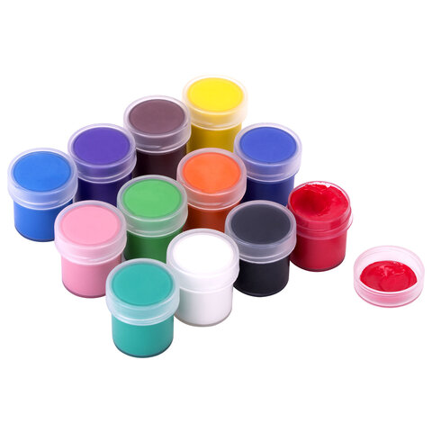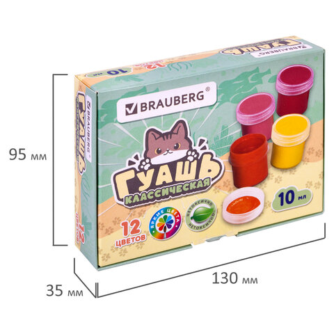 Краски полностью безопасны в использовании, нетоксичны, без резкого запаха. Гуашь обладает высокой светостойкостью и укрывистостью, легко cмешивается и размывается водой, хорошо наносится, без труда удаляется с рук и одежды. Краски разлиты в пластмассовые герметичные баночки объемом 10 мл. Общий объем – 120 мл.