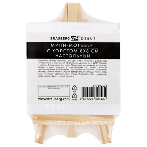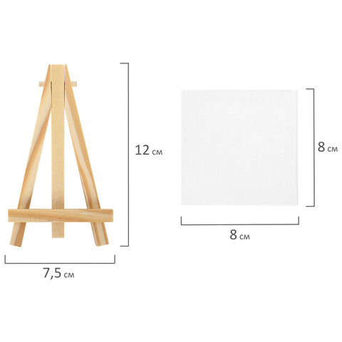 Размер мольберта – 12х7,5 см. Размер холста – 8х8 см. Набор упакован в термоусадку.