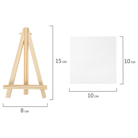 Размер мольберта – 15х8 см. Размер холста – 10х10 см. Набор упакован в термоусадку.