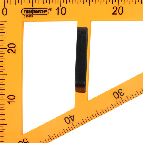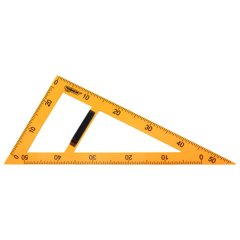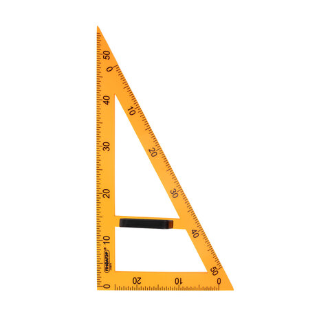 Изготовлен из прочного пластика. Длина шкалы – 50 см, углы – 30° и 60°. Обладает четкой контрастной печатной разметкой. Цвет треугольника – оранжевый. Упакован в воздушно-пузырчатую пленку.