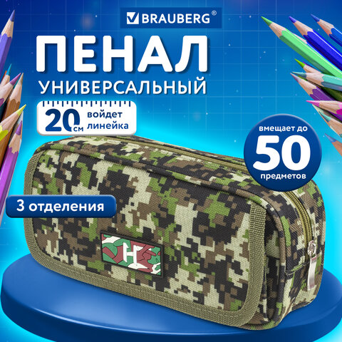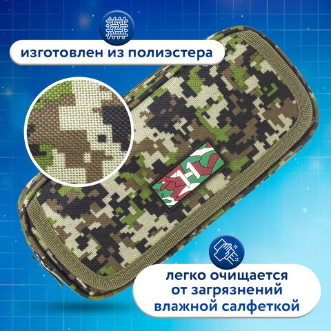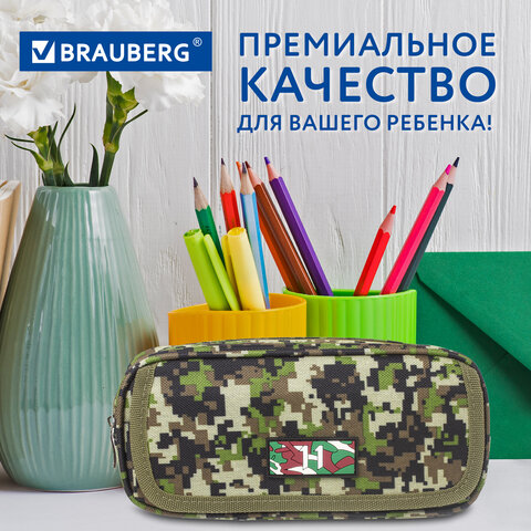 Пенал BRAUBERG для мальчиков, 1 отделение, органайзер, мягкий, "Military", зеленый, 21х5х9 см, 228990