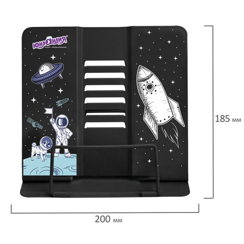 Назначение: для книг и учебников Регулируемый угол наклона: да Держатель для страниц: нижний Серия: Cute Материал корпуса: металл Высота: 18.5 см Ширина: 20 см Цвет: черный Дизайн: Space Упаковка: пакет