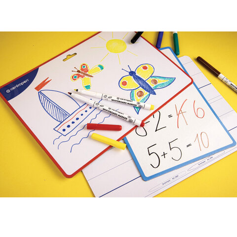 Двусторонняя маркерная доска формата А4 с расчерченными линиями строк и нижними вспомогательными линиями. В комплекте есть 2 маркера для доски и салфетка для удаления надписей.