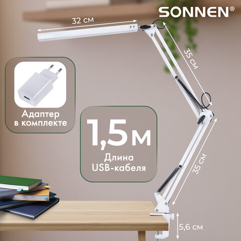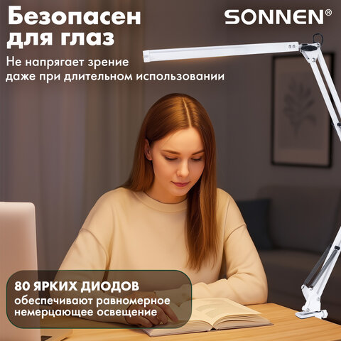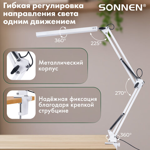 Cветодиодная лампа SONNEN ST-001 на струбцине сочетает в себе высокую мощность 14 Вт и продуманный функционал для комфортной работы в любых условиях. Благодаря 80 ярким диодам лампа обеспечивает равномерное, немерцающее освещение, которое не напрягает зрение даже при длительном использовании.