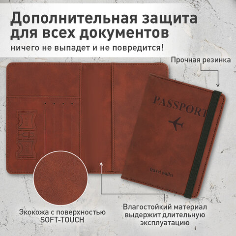 Модель выполнена из экокожи коричневого цвета c приятной на ощупь soft touch-поверхностью и украшена тиснением в виде надписи "Passport", "travel wallet" и силуэта самолета.
