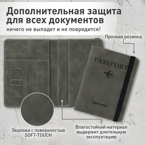 Модель выполнена из экокожи графитового цвета c приятной на ощупь soft touch-поверхностью и украшена тиснением в виде надписи "Passport", "travel wallet" и силуэта самолета.