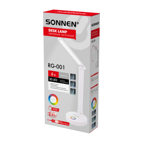 Откройте для себя многофункциональную светодиодную лампу-светильник SONNEN RG-001. Лампа обладает мощностью 6 Вт и 30 яркими диодами. Этот светильник легко создаёт комфортную атмосферу в любой комнате благодаря встроенной RGB-подсветке. Три режима цветовой температуры – тёплый, нейтральный и холодный свет – идеально подойдут как для отдыха, так и для работы, а функция ночника обеспечит мягкое, ненавязчивое освещение в ночное время. Бесступенчатая регулировка яркости позволяет точно настроить свет под свои нужды – от приглушённого свечения до яркого рабочего света.