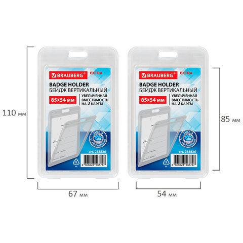 Бейдж вертикальный (85х54 мм) на 2 карты, с лентой 45 см, ЗАЩИТА ОТ ВЛАГИ И ПЫЛИ, BRAUBERG EXTRA,...
