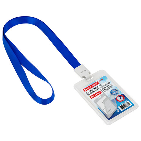 Бейдж вертикальный для пропуска и ID-карт, СИЛИКОНОВЫЙ, 85х54 мм, шнурок 42 см, синий, BRAUBERG,...