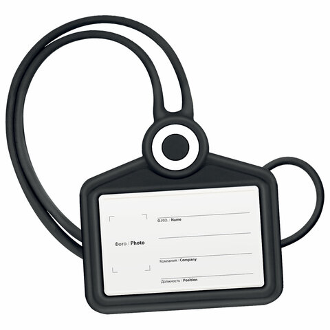 Тип бейджа: для проездных, пропусков, карт Тип крепления: лента Положение: горизонтальное Количество в комплекте: 1 шт. Размер вкладыша (ДхШ): 54х85 мм Размер бейджа (ДхШ): 100х102 мм Серия: Silicone Цвет крепления: черный Материал корпуса: силикон Цвет корпуса: черный Длина ленты/шнурка: 42 см Наличие картонной вставки: да