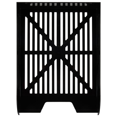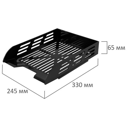 Изготовлен из прочного полистирола. Размер (ГхШхВ) – 330х245х65 мм. Обладает устойчивой конструкцией, благодаря которой удобен для хранения объемных документов и папок.