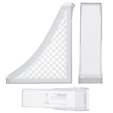 Изготовлен из прочного полистирола. Размер (ГхШхВ) – 240х80х290 мм. Обладает устойчивой конструкцией, благодаря которой удобен для хранения объемных документов и папок.