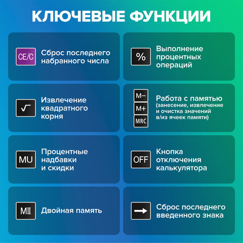 Калькулятор производит все основные арифметические действия: возведение в степень, вычисления с процентами, извлечение квадратного корня. Незаменим для бухгалтеров благодаря наличию клавиш двойной памяти, «00» и MU для расчетов налогов и торговой наценки. Переключатели округления и положения десятичного знака позволяют производить нужные настройки. Большой двенадцатиразрядный дисплей отображает большие значения с высокой точностью округления. Встроенный аккумулятор и солнечная батарея позволяют калькулятору работать при любом освещении, а клавиша выключения OFF и функция автоматического отключения (через 8-10 минут бездействия) позволяют максимально продлить срок его службы без замены батареи.