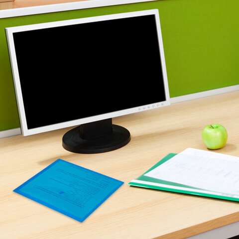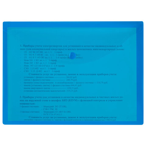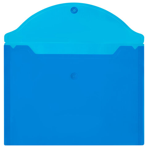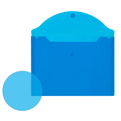 Папка-конверт с гладкой фактурой формата А5 изготовлена из плотного прозрачного пластика синего цвета толщиной 150 мкм. Закрывается на защелку-кнопку, что делает удобным частое использование и обеспечивает быстрый доступ к ее содержимому. Папка способна вместить до 100 листов стандартной плотности.