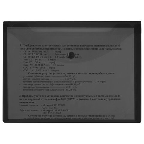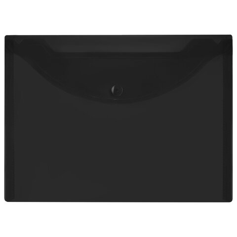 Папка-конверт с гладкой фактурой формата А5 изготовлена из плотного прозрачного пластика черного цвета толщиной 150 мкм. Закрывается на защелку-кнопку, что делает удобным частое использование и обеспечивает быстрый доступ к ее содержимому. Папка способна вместить до 100 листов стандартной плотности.