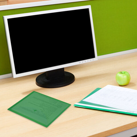 Папка-конверт с гладкой фактурой формата А5 изготовлена из плотного прозрачного пластика зеленого цвета толщиной 150 мкм. Закрывается на защелку-кнопку, что делает удобным частое использование и обеспечивает быстрый доступ к ее содержимому. Папка способна вместить до 100 листов стандартной плотности.