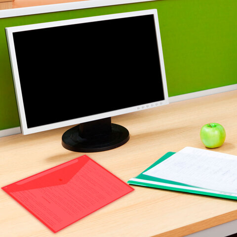 Папка-конверт с гладкой фактурой формата А4 изготовлена из плотного пластика толщиной 150 мкм. Закрывается на защелку-кнопку, что делает удобным частое использование и обеспечивает быстрый доступ к ее содержимому. Папка способна вместить до 100 листов стандартной плотности.
