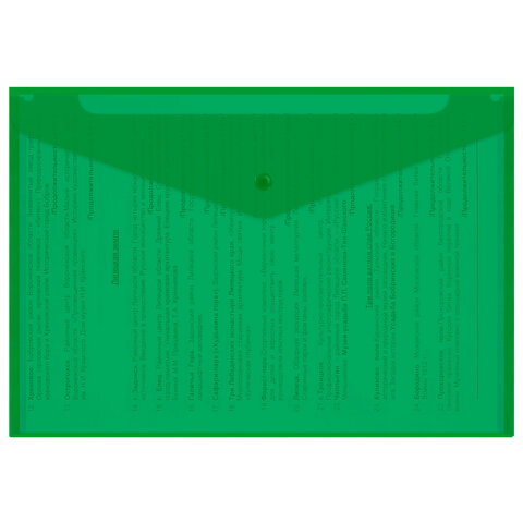 Формат: А4 Ориентация: горизонтальная Вмещает до: 100 листов Фактура: гладкая Тип пластика: полупрозрачный Серия: Universal Дизайн: зеленый Количество в комплекте: 1 шт. Толщина пластика: 150 мкм Тип замка: кнопка Цвет: зеленый Высота: 235 мм Ширина: 328 мм Глубина: 3 мм Материал: полипропилен