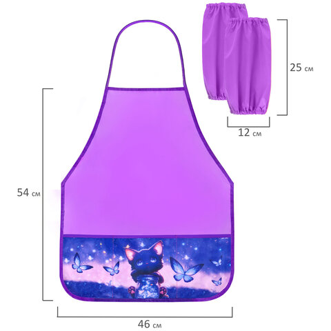 Фартук и нарукавники изготовлены из водоотталкивающего полиэстера. Стандартный размер фартука – 54х46 см, размер нарукавников – 25х12 см. Крепление фартука на завязках. Кроме того, фартук оснащен 3 карманами для канцелярии и прочих принадлежностей, которые всегда должны быть под рукой во время уроков труда и занятий творчеством.