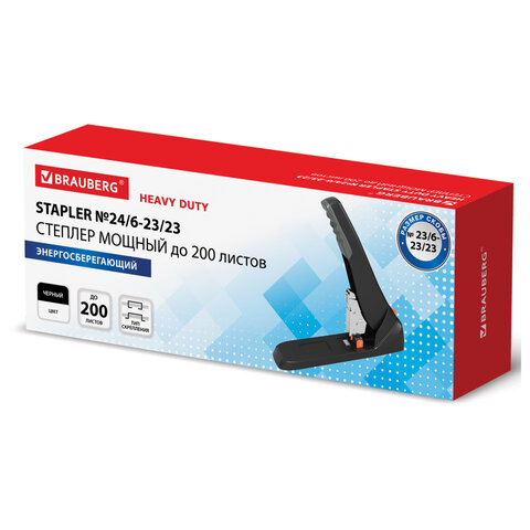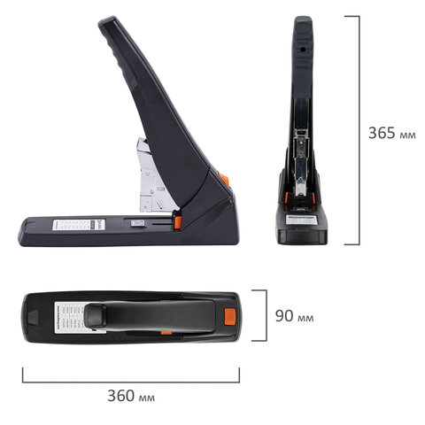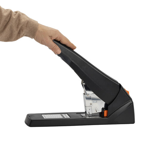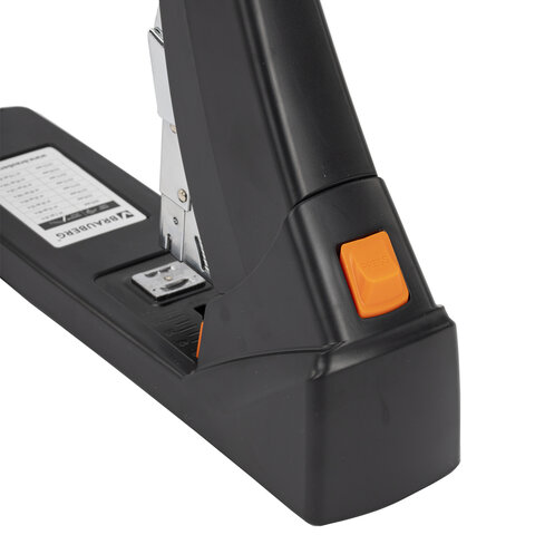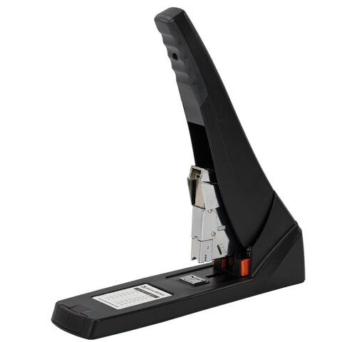 Рабочий механизм выполнен из металла, корпус – из пластика черного цвета. Способен скрепить до 200 листов бумаги. Подходит для скоб № 24/6 - № 23/23. Глубина закладки бумаги регулируется – до 50 мм. Закрытый вид сшивания.