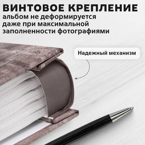 Состоит из 50 полипропиленовых листов размером 15,5х24,5 см с карманами и вмещает 200 фотографий размером 10х15 см по 2 штуки на странице. Обложка фотоальбома выполнена в коричнево-бежевых тонах и понравится любителям истории и приключений. Фотоальбом с винтовым переплетом отличается повышенной прочностью и долгим сроком службы. Альбом не деформируется даже при максимальной заполненности фотографиями. Размер – 19,5х25,5 см. Размер окошка под фото на обложке – 6х4 см.