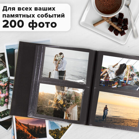 Состоит из 50 полипропиленовых листов размером 15,5х24,5 см с карманами и вмещает 200 фотографий размером 10х15 см, по 2 штуки на странице. Обложка фотоальбома выполнена в темно-коричневом цвете и стилизована под фактурную кожу. Фотоальбом с книжным переплетом отличается повышенной прочностью и долгим сроком службы. Размер - 20,7х21,8 см.
