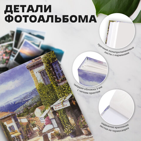Тип листов: полипропиленовые листы с карманами Макс. количество фотографий: 200 шт Размер фотографий: 10х15 см Тип обложки: твердая Базовый цвет обложки: разноцветный Дизайн: Улица Прованса Количество листов: 50 шт. Размер листа: 17,5х22 см Скрепление страниц: термосварка Цвет страниц: белый Высота альбома: 23 см Ширина альбома: 18 см Ширина корешка: 5 см Упаковка: воздушно-пузырчатый пакет