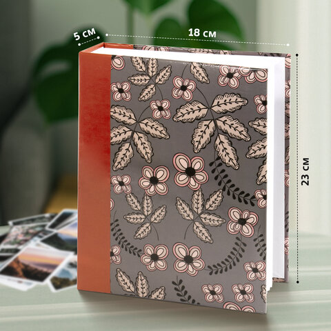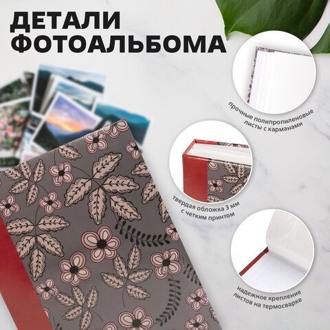 Фотоальбом BRAUBERG на 200 фото 10х15 см, твердая обложка, "Флора", серый с красным,...