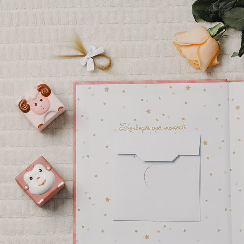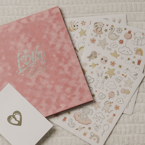 В набор входят 3 листа стикеров для девочки, открытка с ножками в подарок, а также маленький конвертик для мелочей на внутренней стороне обложки, куда можно поместить бирку из роддома, снимок УЗИ, локон ребенка.