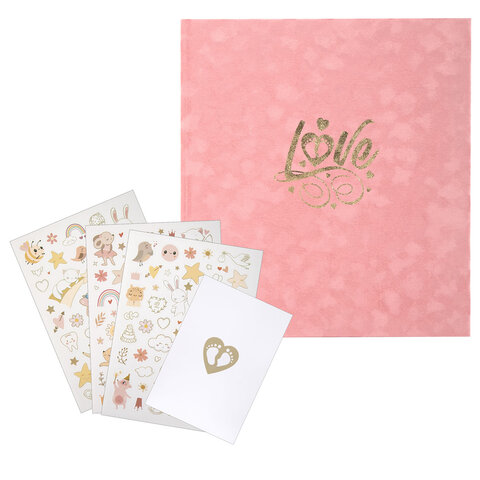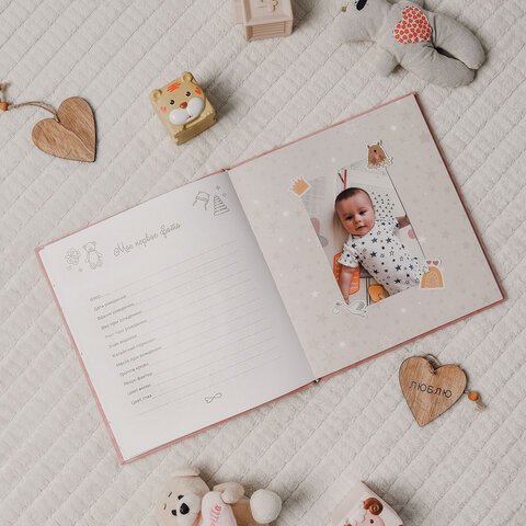 Альбом состоит из 64-х бумажных страниц размером 22,6х24,6 см с красочными детскими рисунками. Каждая страница позволит сохранить значимые моменты малыша – от его рождения, первого купания и первой прогулки, и до 5 лет! Альбом c бархатной розовой обложкой станет важным семейным архивом, ведь в нем можно описать не только историю рождения и развития малыша, но и внести информацию о семье: о маме и папе, составить семейное древо.