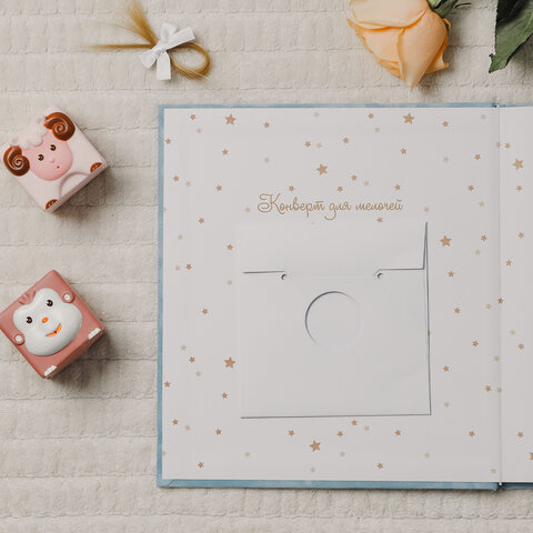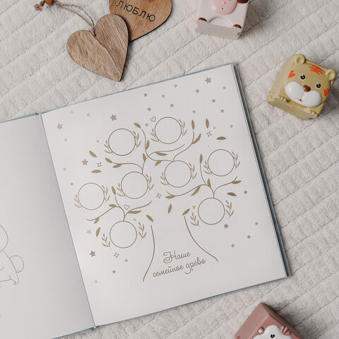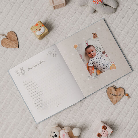 Альбом состоит из 64-х бумажных страниц размером 22,6х24,6 см с красочными детскими рисунками. Каждая страница позволит сохранить значимые моменты малыша – от его рождения, первого купания и первой прогулки, и до 5 лет! Альбом c бархатной голубой обложкой станет важным семейным архивом, ведь в нем можно описать не только историю рождения и развития малыша, но и внести информацию о семье: о маме и папе, составить семейное древо.
