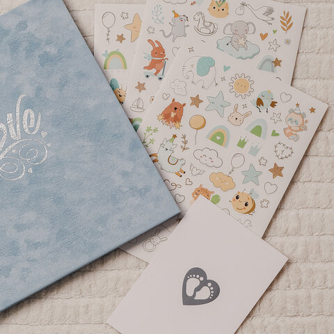 В набор входят 3 листа стикеров для мальчиков, открытка с ножками в подарок, а также маленький конвертик для мелочей на внутренней стороне обложки, куда можно поместить бирку из роддома, снимок УЗИ, локон ребенка.