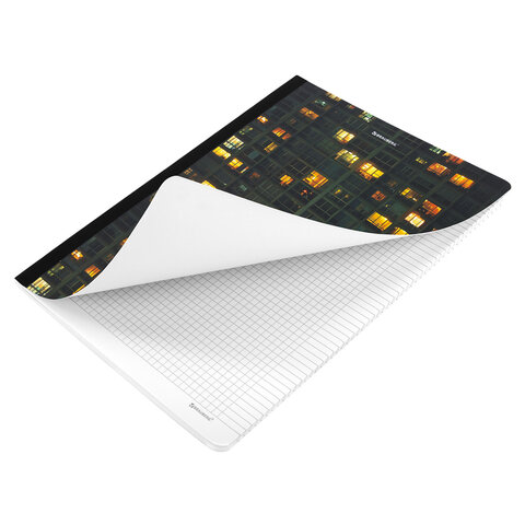 Внутренний блок содержит 96 листов офсетной бумаги плотностью 60 г/м2. Обложка изготовлена из мелованного картона повышенной плотности 300 г/м2 со специальной матовой ламинацией, устойчивой к царапинам и потертостям. Линовка блока –клетка с полями, выполненная в сером цвете для комфортного письма. Сшивка надежно соединяет листы между собой. Корешок тетради проклеен плотным материалом, дополняющим дизайн. Белизна блока – 100%. Формат листов – А4.