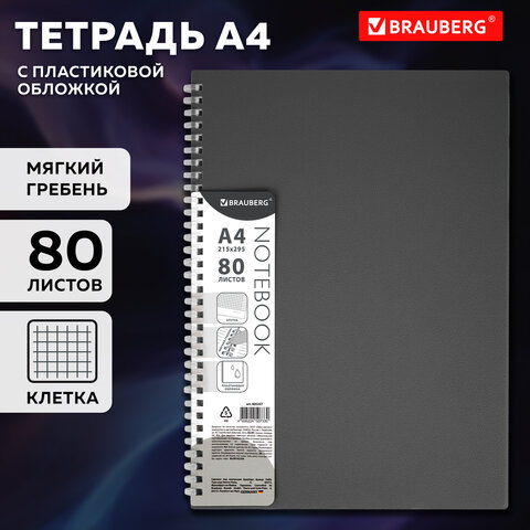 Тетрадь обложка пластик, А4 80 л., гребень мягкий, вырубка для ручки, клетка, BRAUBERG, черный,...