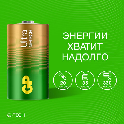 Алкалиновые батарейки GP размера D увеличенной продолжительности работы идеально подходят для приборов с высоким потреблением энергии, таких как механизированные игрушки, фонарики, портативные игровые консоли, пульты дистанционного управления.