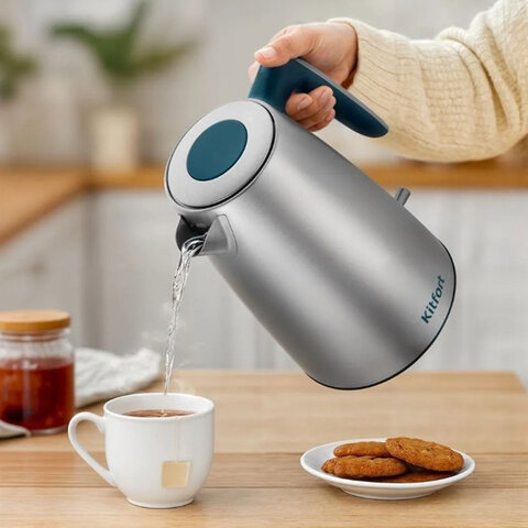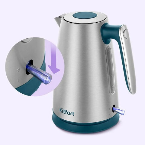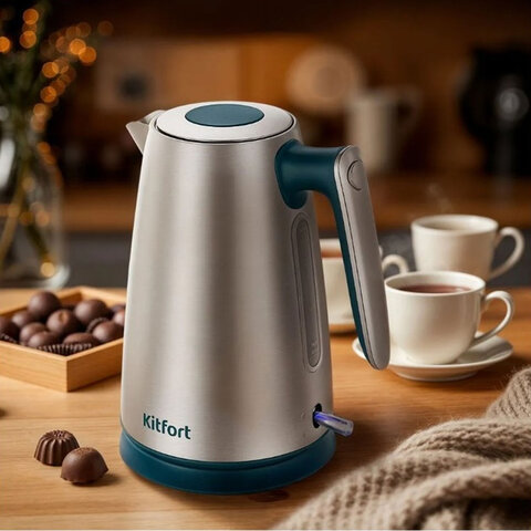 Чайник KITFORT КТ-8725 – это идеальное сочетание элегантности и функциональности. Его строгий металлический корпус в серебристо-бирюзовой гамме станет стильным акцентом на вашей кухне.