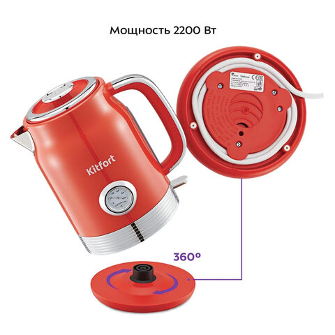 Яркий красный корпус из нержавеющей стали с термоустойчивыми пластиковыми элементами станет настоящим украшением интерьера, а мощность 2200 Вт обеспечивает быстрое кипячение до 1,7 литра воды всего за несколько минут.
