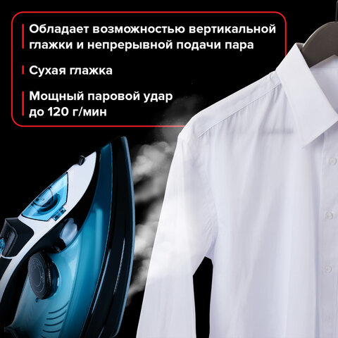 Тип утюга: обычный Мощность: 2400 Вт Паровой удар: 120 г/мин Регулируемый пар: 20 г/мин Тип подошвы: керамическая Функции: вертикальное отпаривание, возможность сухого глаженья, защита от вытекания воды, защита от накипи, индикация готовности к работе, отпаривание, пароувлажнение, разбрызгивание воды, регулировка подачи пара, система самоочистки Резервуар для воды: 270 мл Мерный стакан: да Длина шнура: 1.9 м Шаровое крепление шнура: да Цвет корпуса: белый/синий Вес: 1.1 кг Серия: SI