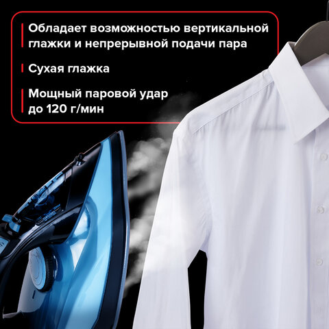 Тип утюга: обычный Мощность: 2400 Вт Паровой удар: 120 г/мин Регулируемый пар: 20 г/мин Тип подошвы: керамическая Функции: вертикальное отпаривание, возможность сухого глаженья, защита от вытекания воды, защита от накипи, индикация готовности к работе, отпаривание, пароувлажнение, разбрызгивание воды, регулировка подачи пара, система самоочистки Резервуар для воды: 380 мл Мерный стакан: да Длина шнура: 1.9 м Шаровое крепление шнура: да Цвет корпуса: черный/синий Вес: 1.2 кг Серия: SI