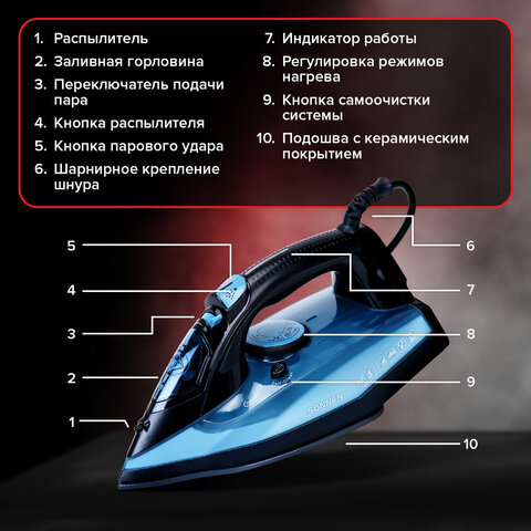 Сетевой шнур длиной 1,9 м крепится с помощью удобного шарового крепления, не позволяющего ему перекручиваться у основания. Небольшой вес устройства сделает даже долгий процесс глажения комфортным.